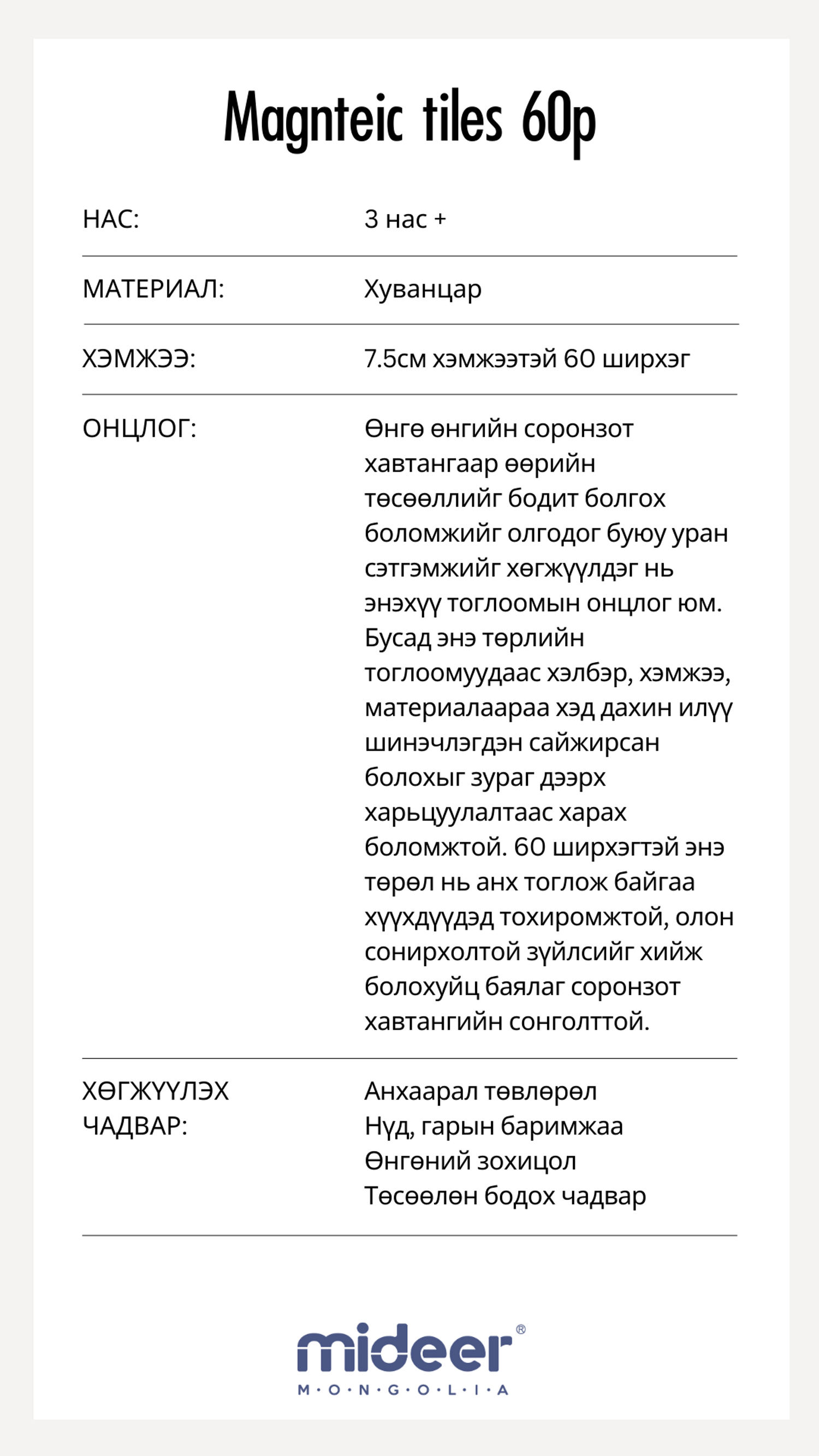 СОРОНЗТОЙ ТОГЛООМ - MAGNETIC TILES 60P