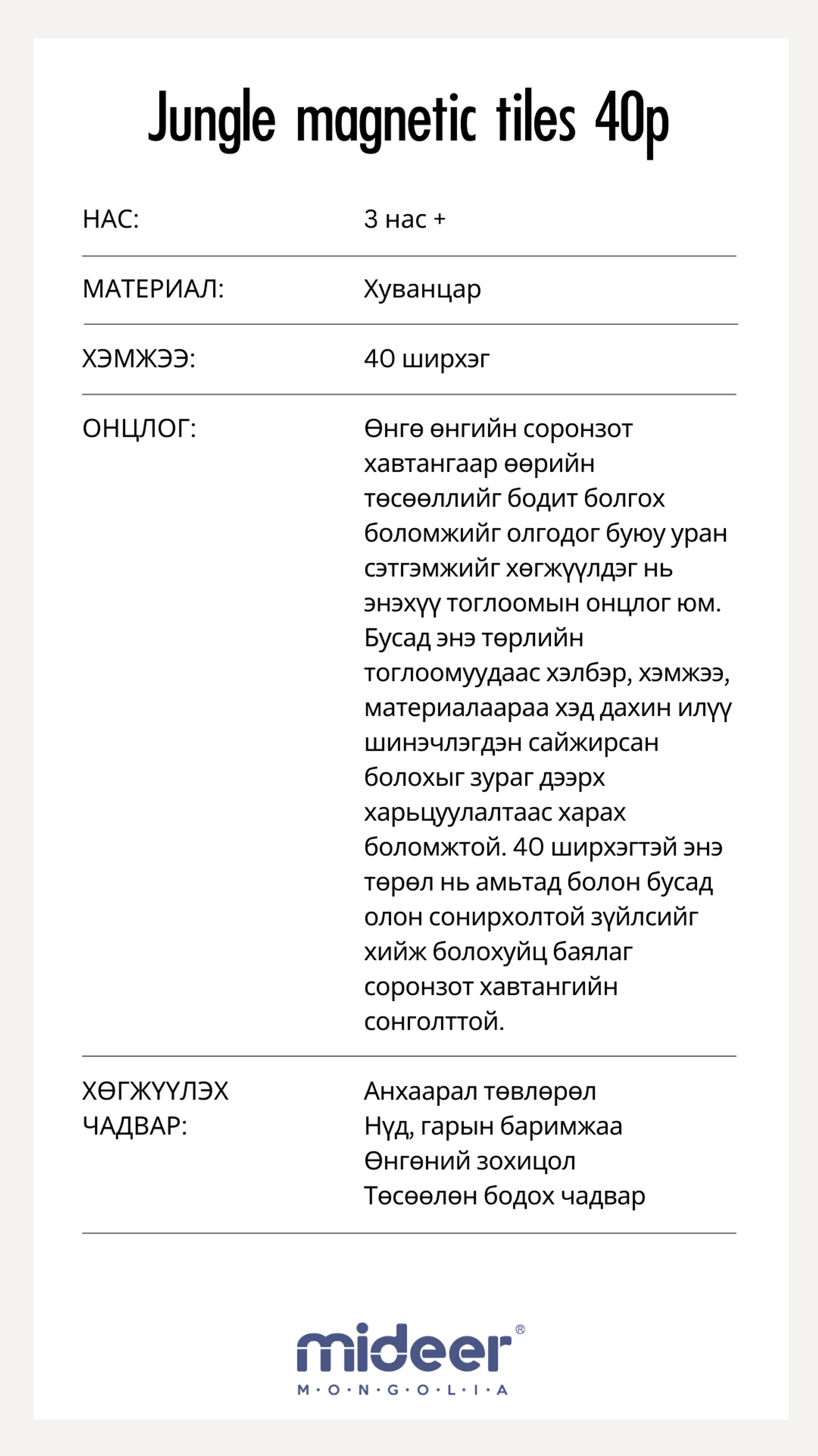СОРОНЗТОЙ ТОГЛООМ - JUNGLE MAGNETIC TILES